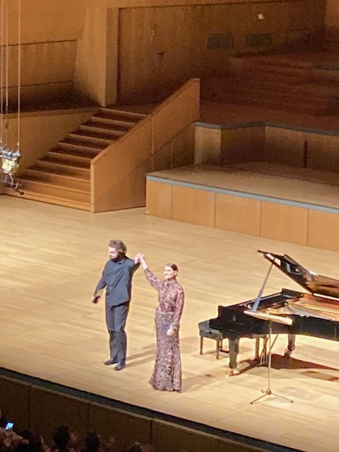Αυτό που μάς είχε εντυπωσιάσει στο Grosses Festspielhaus ήταν η καθ’ όλη τη διάρκεια τής όπερας αβίαστη προβολή στην αίθουσα μιας φωνής που έμοιαζε να αναβλύζει με την μεγαλύτερη νοητή φυσικότητα από ένα σωματικό μηχανισμό αλώβητο σε πιέσεις έκτασης και αναπνοής. Και, ώ τού θαύματος, και αυτό το βράδυ της 17ης Οκτωβρίου, ήδη από την αρχική «Δίνη τού χορού» -και παρά ένα τέμπο από τον πιανίστα Lukas Geniušas, που σχεδόν εξαφάνισε το βαλς του τραγουδιού- βρεθήκαμε ευθύς έκθετοι, όπως και στο Σάλτσμπουργκ, στη σαγήνη μιας φαινομενικά (;) απίστευτα ανεπιτήδευτης φύσης και φραστικής. Και στο επόμενο τραγούδι τού Τσαϊκόφσκι, επίσης βαθιάς μοναξιάς, επιβεβαιώσαμε την ασφαλή και ομοιογενή ανάπτυξη εξαγγελίας μιας φωνής ικανής για τις πλέον απαιτητικές ταλαντώσεις ανάμεσα σε σαρκώδη piani και πλούσιες δραματικές φορτώσεις. Το κινηματογραφικής φήμης, νοσταλγικό, «None but the lonely heart» (ή «Nur wer die Sehnsucht kennt») εδραίωσε την πρόσληψη μιας φωνής που εκφράζεται πιότερο μέσα από διαδρομές δυναμικής παρά από μια παλέτα ηχοχρωμάτων, που στην περίπτωσή της μοιάζει μάλλον περιορισμένη.