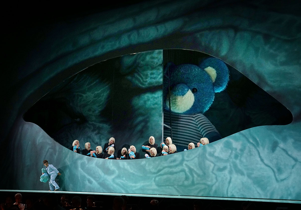 Not that Graham Vick’s new production for the Rossini Opera Festival and the Théâtre Royal de la Monnaie, Brussels, attained the charismatic level of his «Guillaume Tell» achievement. The action was transposed to a capitalist dynastic milieu, contrasting with the shaman like primeval clergy and Indian prince’s Idreno exotism. A huge pair of eyes dominated the proceedings, alternating with the black and white photo of an eyeless murdered king Nino recognised by many as Alberto Zedda himself, a nice latent homage to his 90th birthday anniversary. This somewhat incoherent frame of action (both scenery and costumes by Stuart Nunn) were meant to focus the interest to the péché originaire of a latent past that dictates actions, behaviours and outcome of the drama. A simple bed to the right of the stage was there during the lengthy overture and remained there hosting traumatic experiences of the bloody incident nested in little Ninias’s soul, represented by his equally blood stained teddy bear. This remarkable symbolism attained nevertheless a crude and involuntarily comic dimension as a huge copy of the emblematic plaything overwhelmed the stage. To the assets of the production was a firm and meaningful Personenregie. Less successful though, in spite of her indisputable stage allure, was the choice to present Arsace, the intermittently grown up Ninias, not en travestie, as prescribed in the play, but as a woman, misleading first time viewers to the erroneous conclusion that Semiramide’s advances were not only unknowingly incestuous but also openly lesbian!