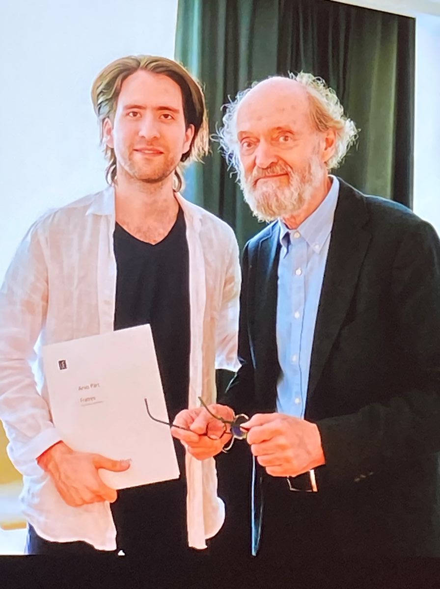 Επιστέγασμα πορείας πάντως και παραλλήλως εφαλτήριο για τον μουσικό υπήρξε η πρώτη παγκόσμια ηχογράφηση τού πιανιστικού έργου τού Arvo Pärt, επ’ ευκαιρία των 90ών γενεθλίων του, με τον συνθέτη να αποτελεί πρώτο σταθμό αμφοτέρων των ημισφαιρίων τής Αθηναϊκής συναυλίας. Ολιγόλεπτες πιανιστικές μινιατούρες τής μετά το 1976 συνθετικής μεθόδου «Tintinnabuli» τού Εσθονού, όπως «Στην Αλίνα» και «’Έξι Παραλλαγές για την ανάρρωση τής Αρίνουσκα», στο α’ μέρος, ή το κινηματογραφικό βαλς «Ukuaru», συνδυάσθηκαν με την μεταγραφή της δημοφιλούς προγενέστερης σύνθεσής του «Fratres» από τον ξένο μας. Την υποβλητικής σιγής ατμόσφαιρα των πρώτων διαδέχθηκε υπερβολικά θορυβώδης (σε σχέση με τον κύλινδρο Welte Mignon του F.Busoni) ανάκρουση τής μεταγραφής από τον Ιταλό συνθέτη της καταληκτικής «Chaconne» από την 2η Παρτίτα για βιολί σόλο τού J.S.Bach, με ευπρόσδεκτη μετάπτωση σε λεπταίσθητη διαχείριση για δύο πρελούδια τού S.Rachmaninov.